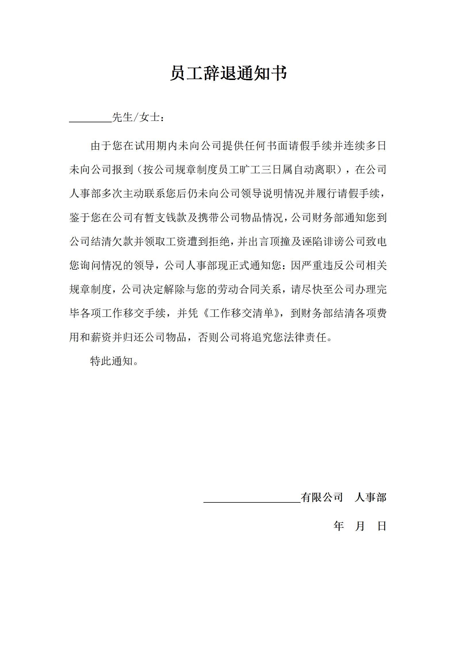 由于您在试用期内未向公司提供任何书面请假手续并连续多日未向公司报到(按公司规章制度员工旷工三日属自动离职)